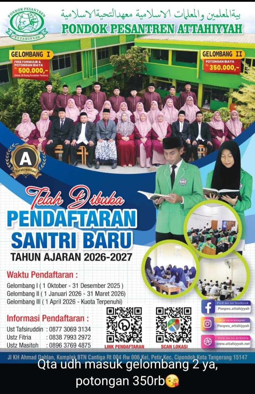 Pondok Pesantren Attahiyyah senantiasa membuka diri untuk menerima komunikasi, silaturahmi, dan kerja sama dari masyarakat, wali santri, calon santri, serta seluruh pihak yang ingin mengenal lebih dekat dunia pesantren. Melalui halaman ini, kami menyediakan informasi kontak resmi agar setiap pertanyaan, konsultasi, maupun kebutuhan informasi dapat disampaikan dengan mudah dan tepat.